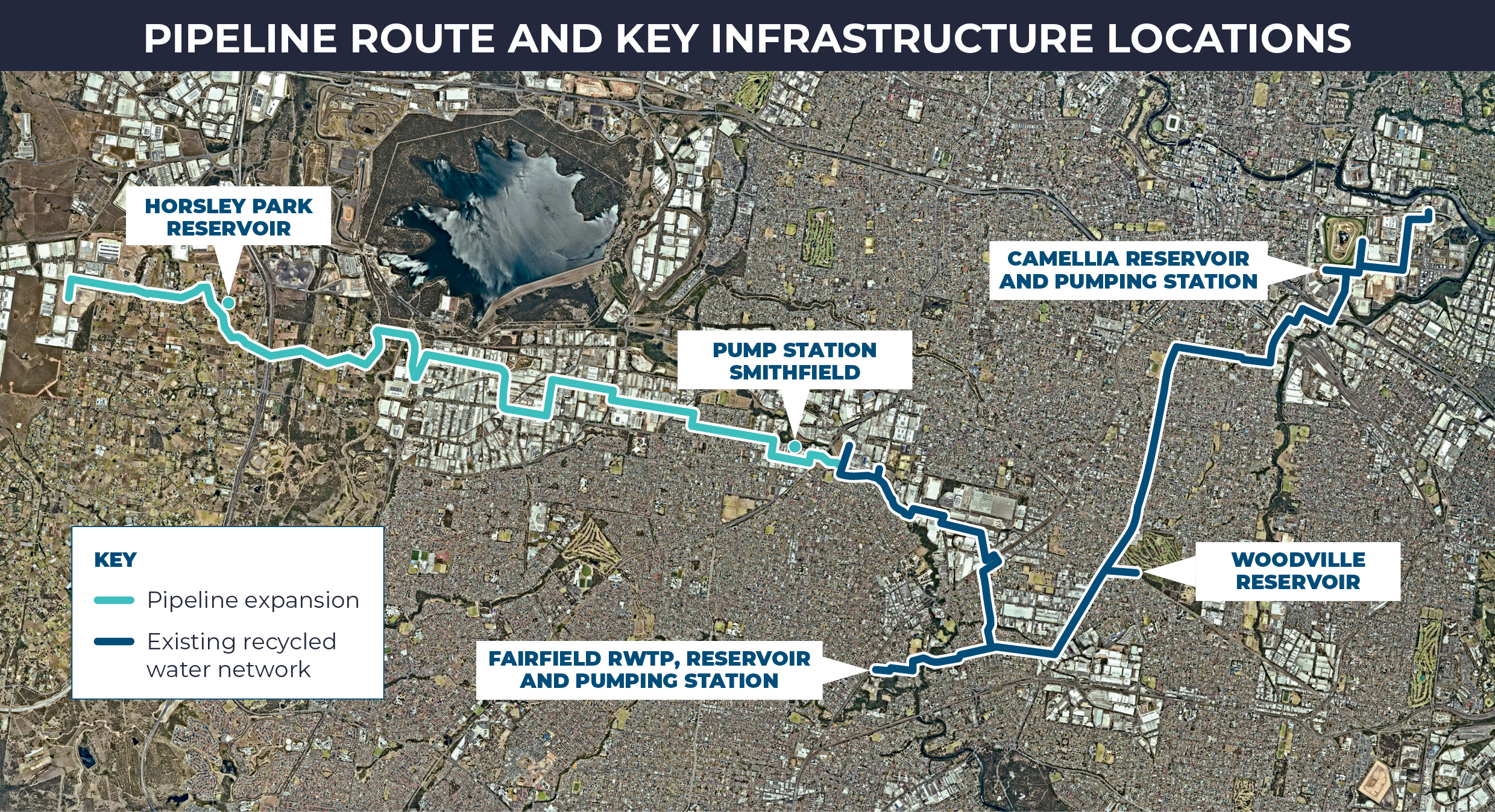 - Approximately 16km of new pipelines will be constructed to transfer recycled water from the existing AquaNet network in Smithfield west to developments in Horsley Park.